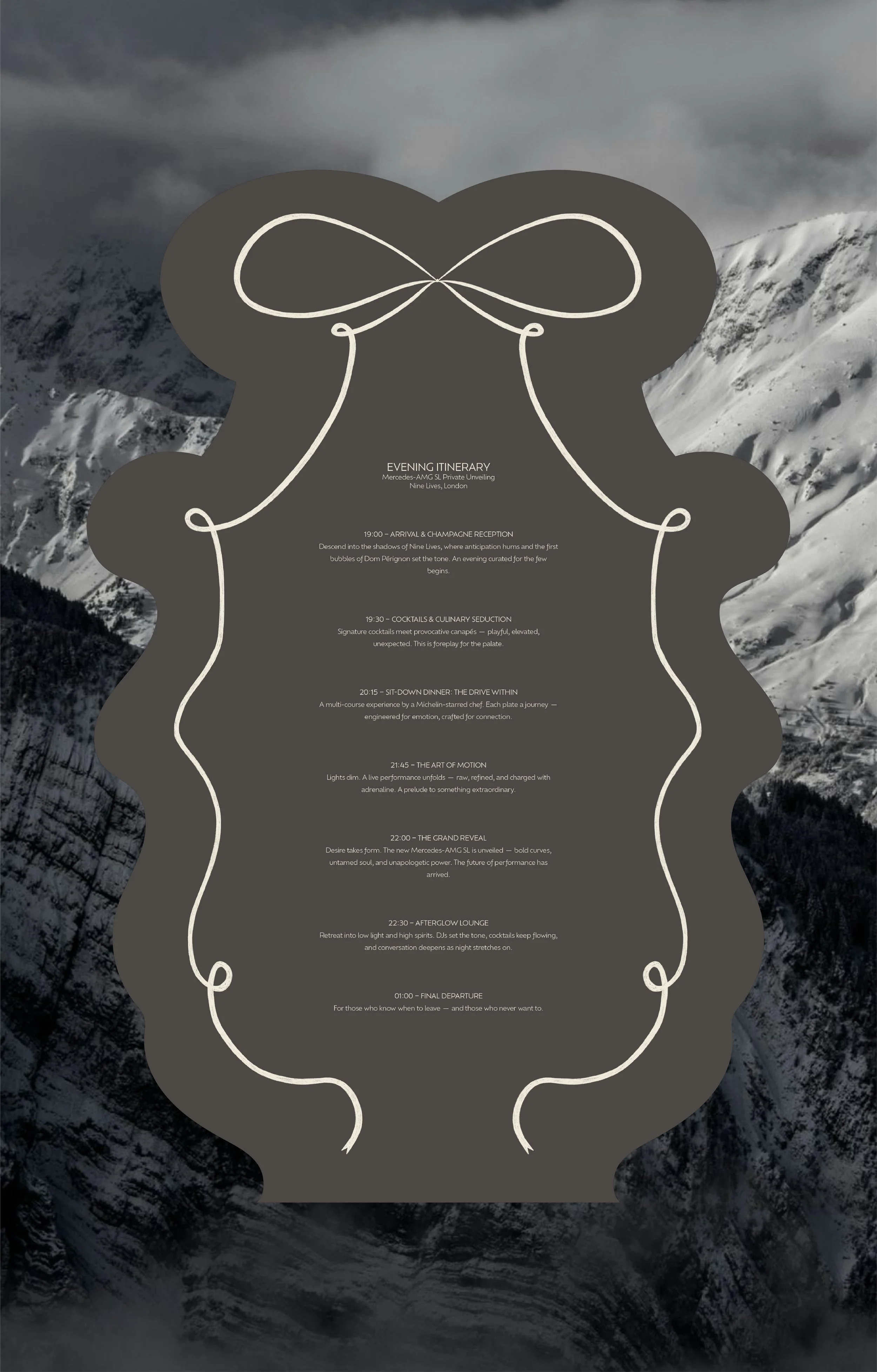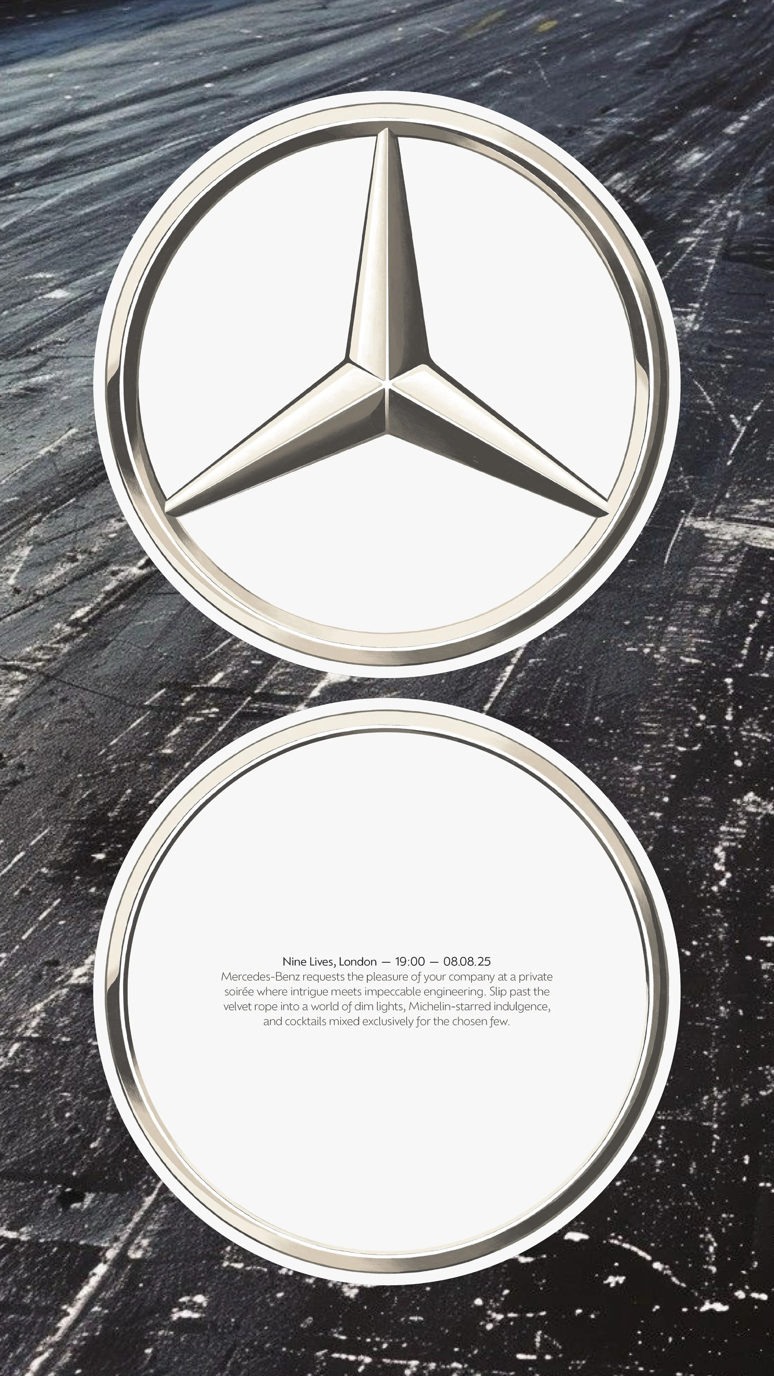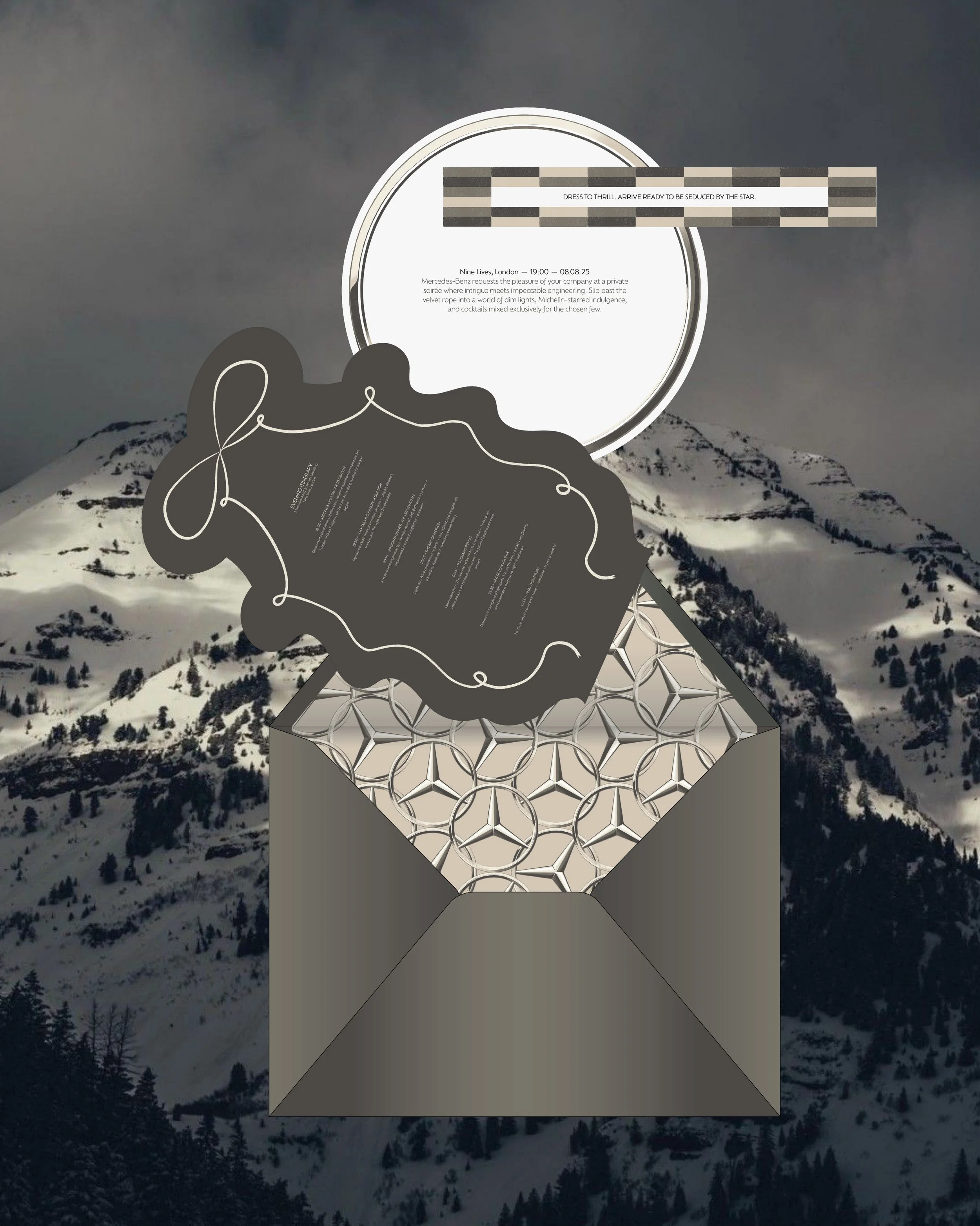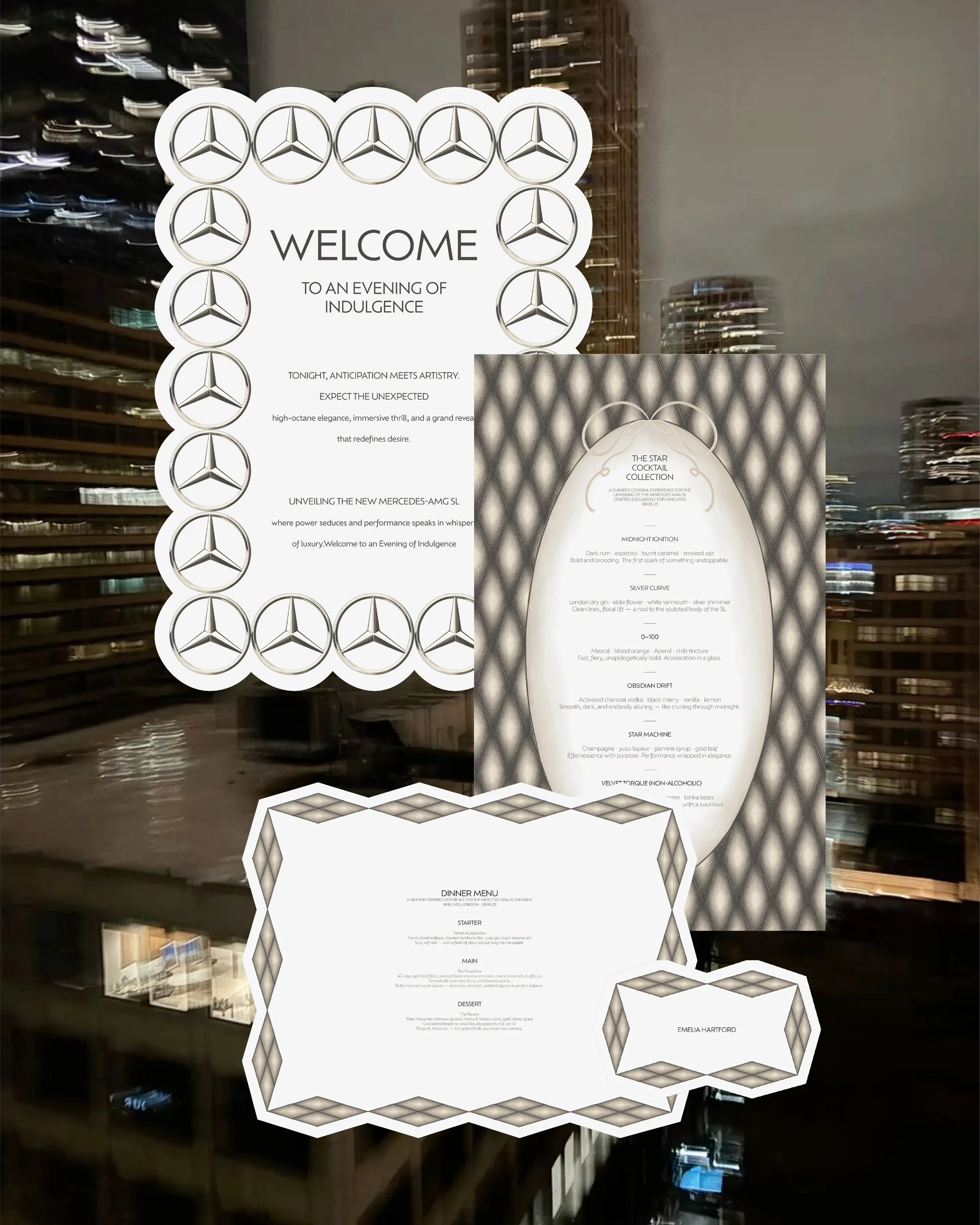 This luxury influencer event for Mercedes-Benz to celebrate a new car reveal at Nine Lives, London. The concept was sleek, exclusive, and full of high-end detail. The invitation suite featured a hand-drawn circular invite, a bow-shaped evening itinerary, and a dress code card, all enclosed in a bespoke envelope. On the night, I created a cohesive set of designs including bar and food menus, placemats, place cards, a repeat-pattern table runner, a seating chart, and a welcome sign. Guests also received a curated goodie bag with a custom event hoodie and thank you card. Every element was carefully considered, brought together in a moody, luxurious palette and elevated with my signature hand-drawn design aesthetic.