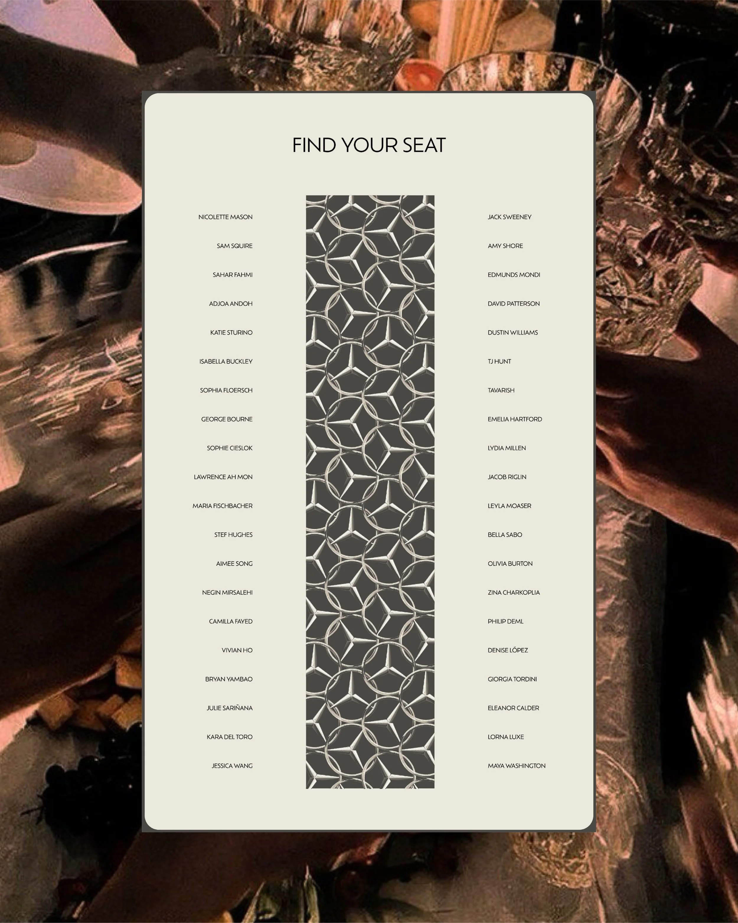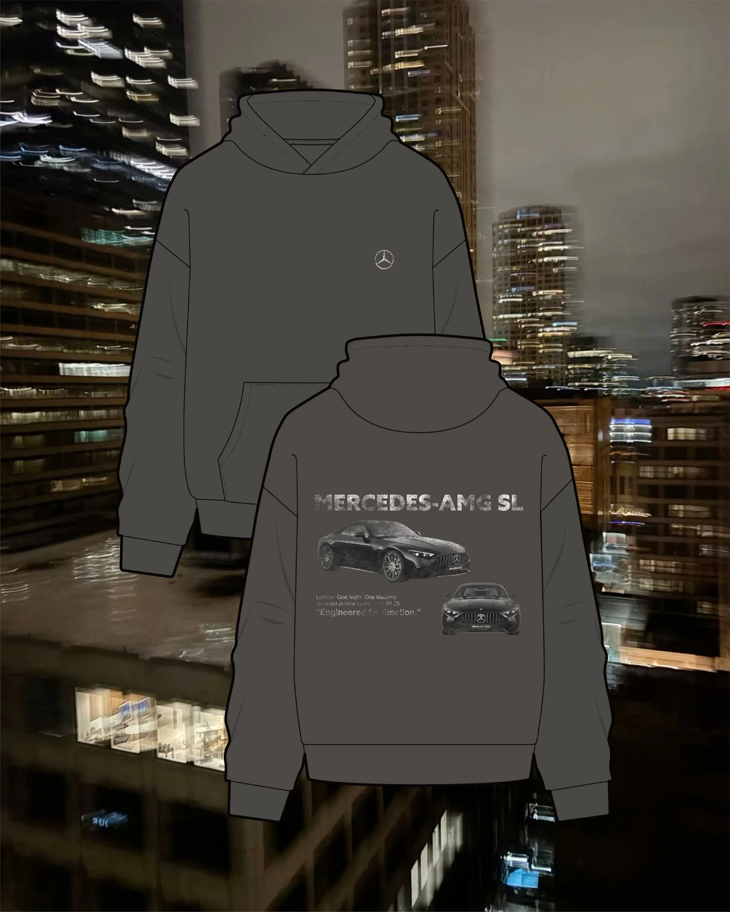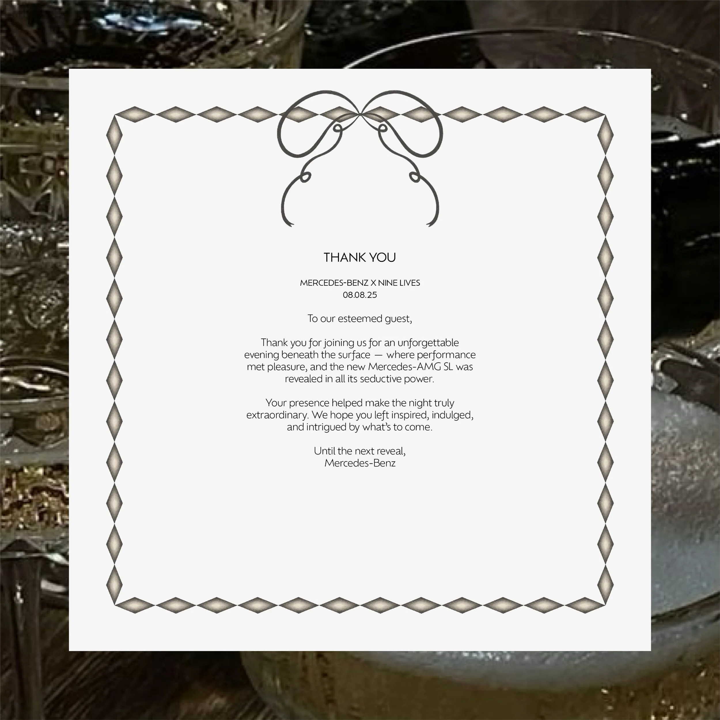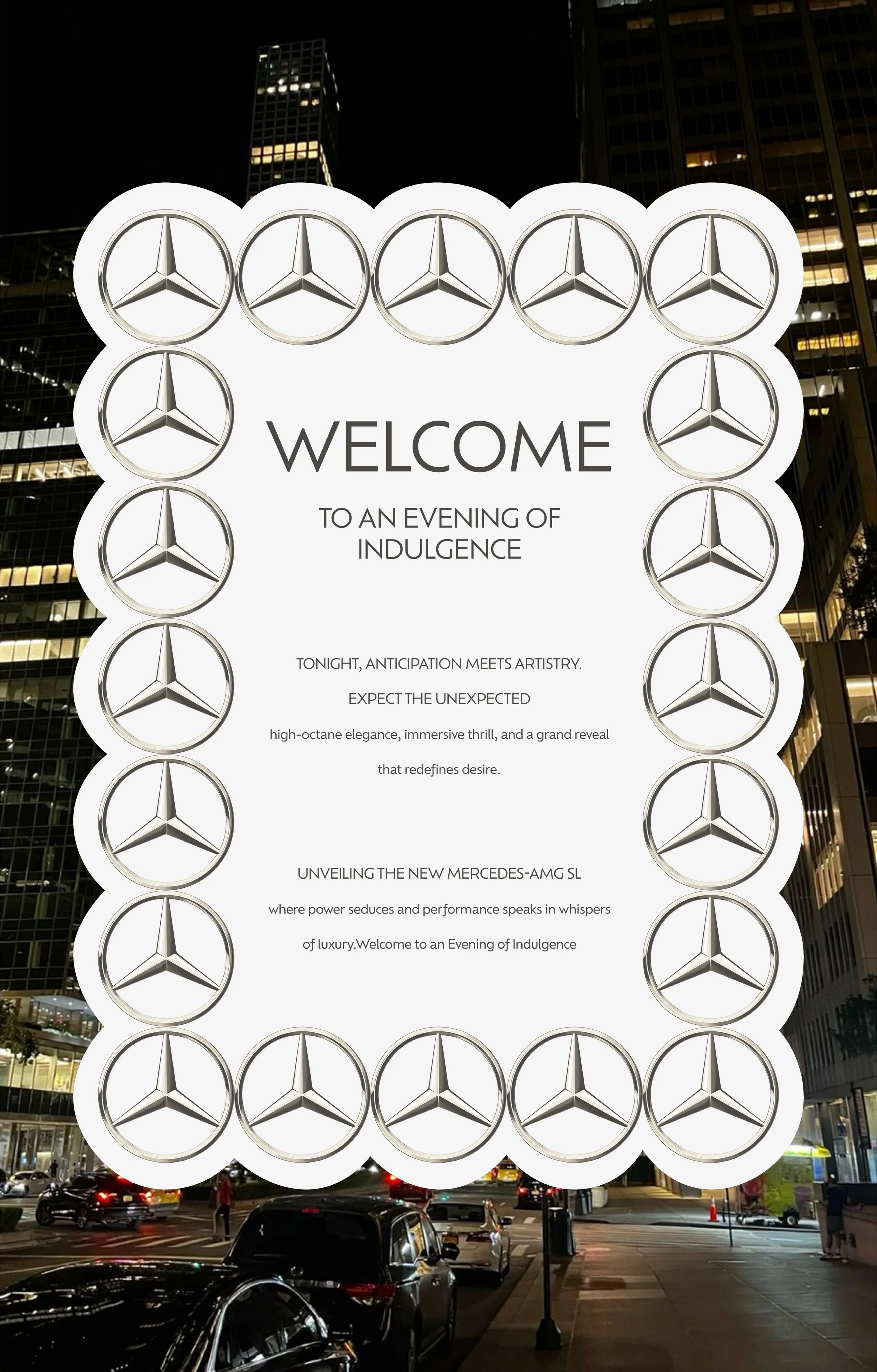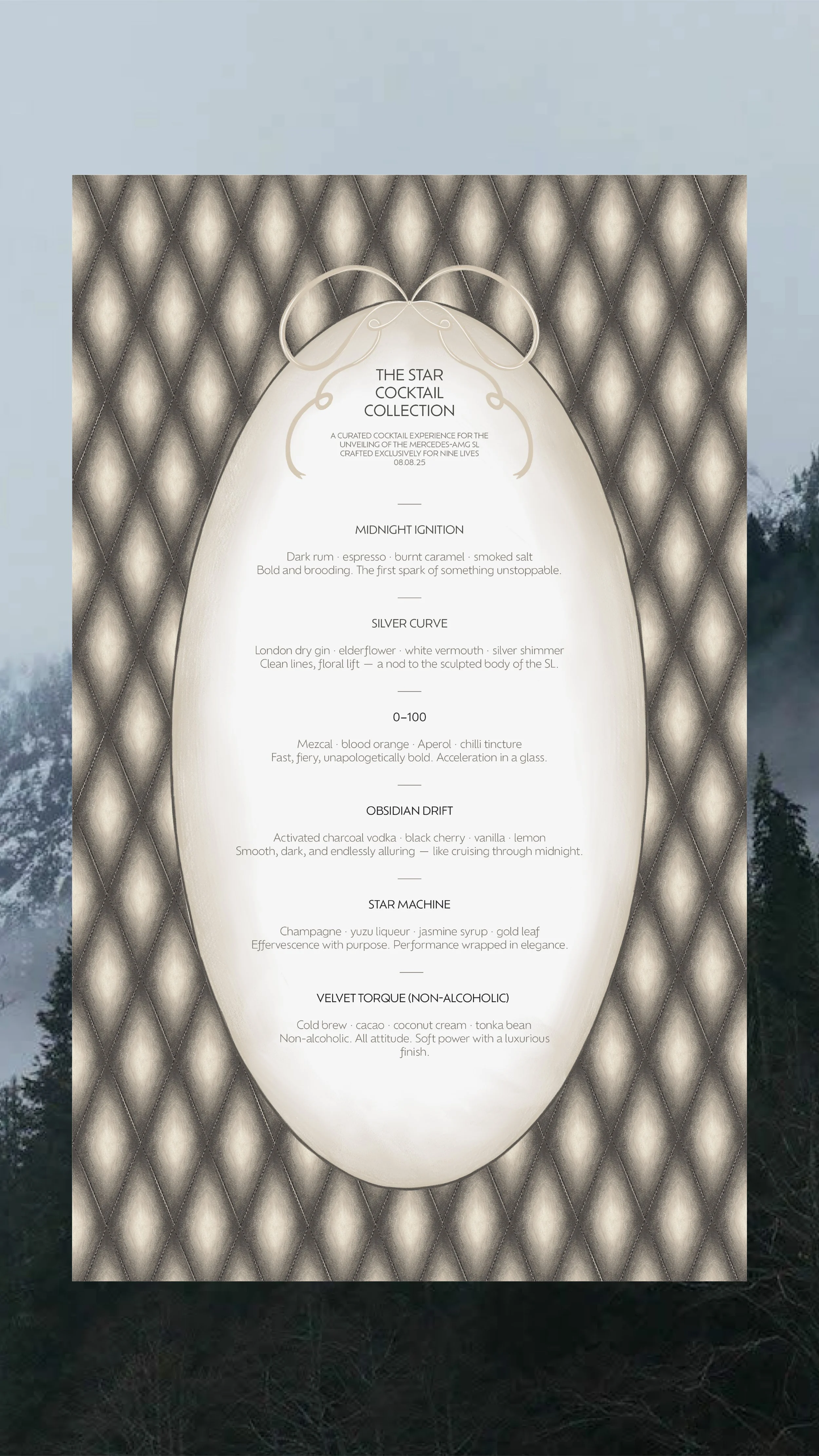 This luxury influencer event for Mercedes-Benz to celebrate a new car reveal at Nine Lives, London. The concept was sleek, exclusive, and full of high-end detail. The invitation suite featured a hand-drawn circular invite, a bow-shaped evening itinerary, and a dress code card, all enclosed in a bespoke envelope. On the night, I created a cohesive set of designs including bar and food menus, placemats, place cards, a repeat-pattern table runner, a seating chart, and a welcome sign. Guests also received a curated goodie bag with a custom event hoodie and thank you card. Every element was carefully considered, brought together in a moody, luxurious palette and elevated with my signature hand-drawn design aesthetic.