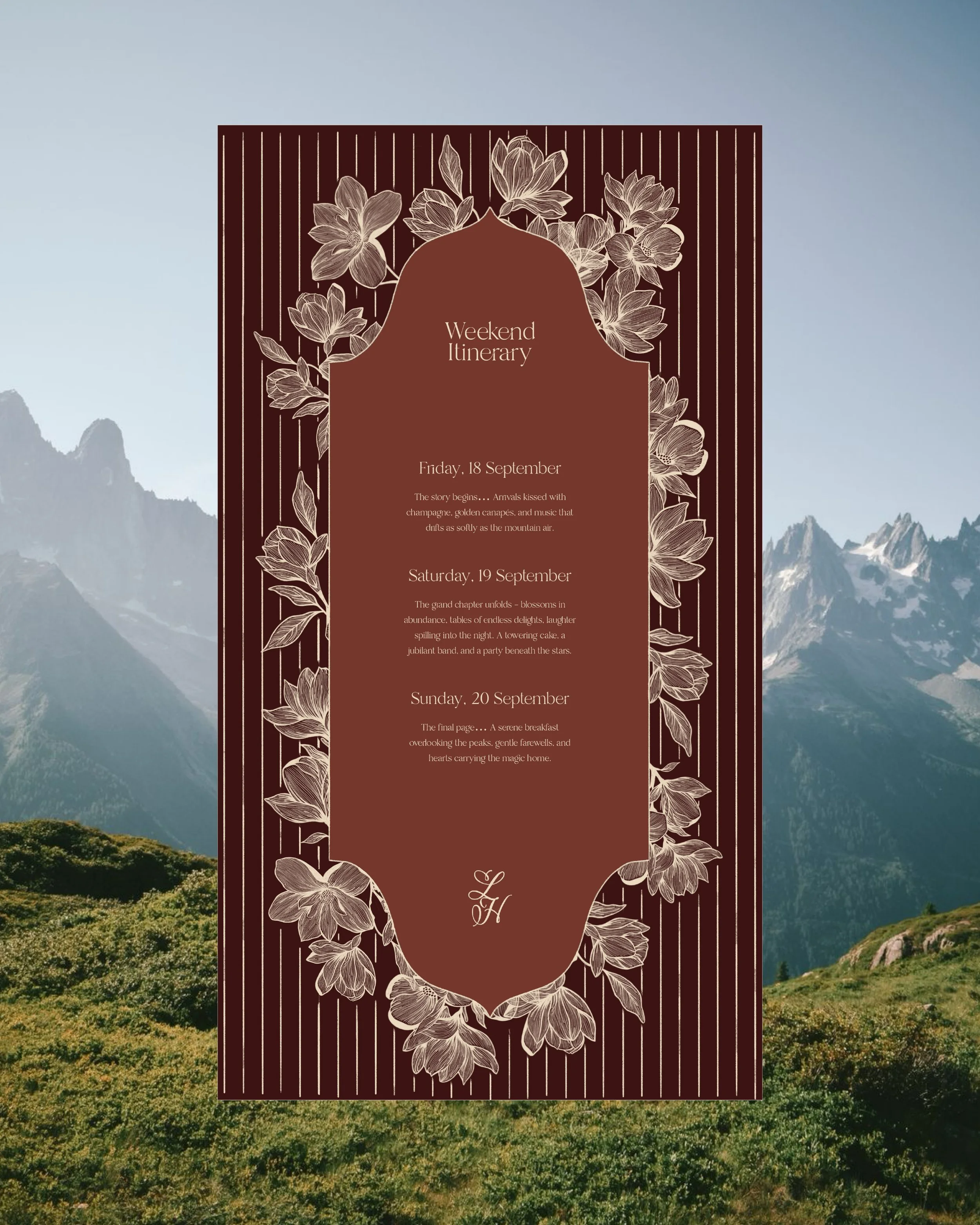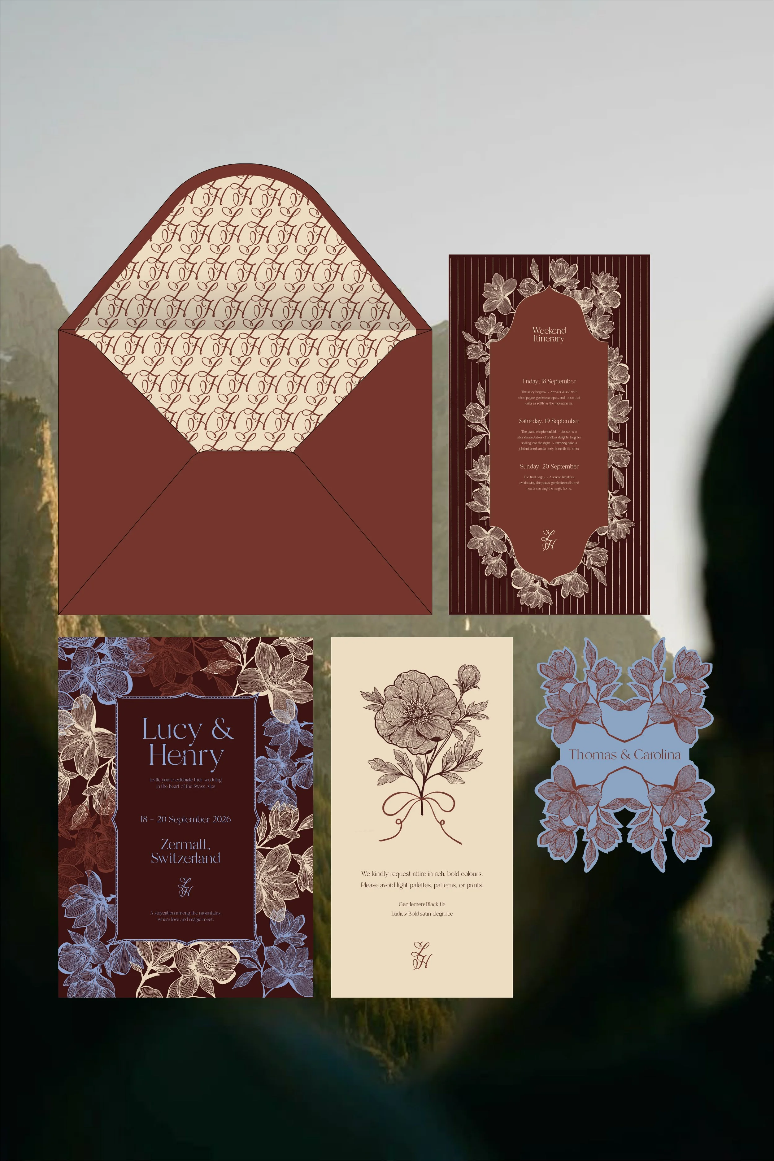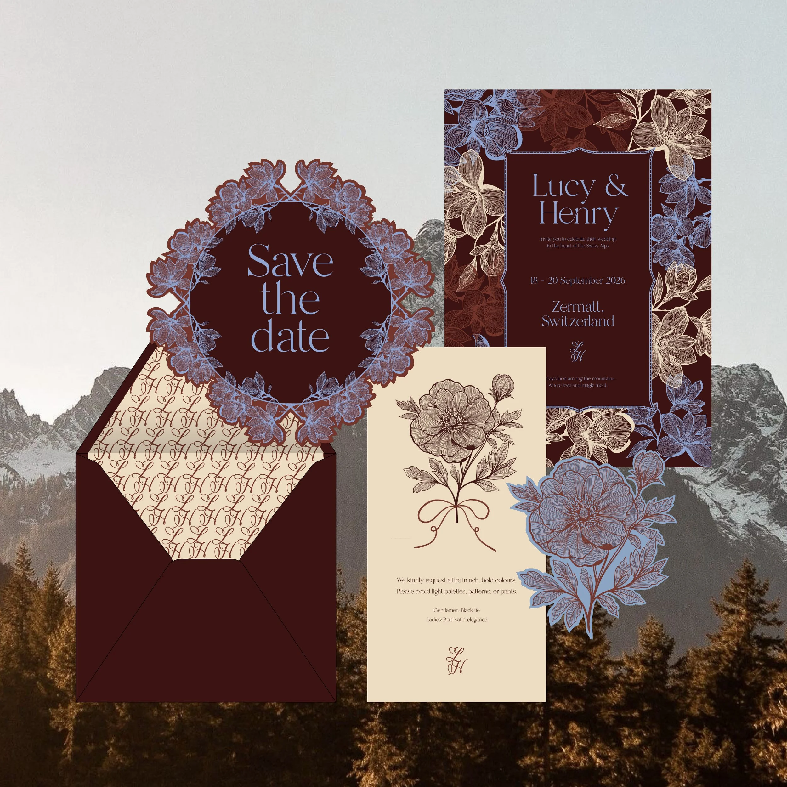 This wedding invitation suite combines timeless elegance with a contemporary touch, designed to perfectly complement a wedding set amidst the stunning Swiss Alps. From the save-the-date to the formal invitation and weekend details, Lucy and Henry envisioned something truly memorable, with flowers at the heart of their theme. Classic elements were reimagined with a modern colour palette inspired by the alpine landscape, while delicate custom-cut card shapes added an extra layer of sophistication to this dramatic floral suite.